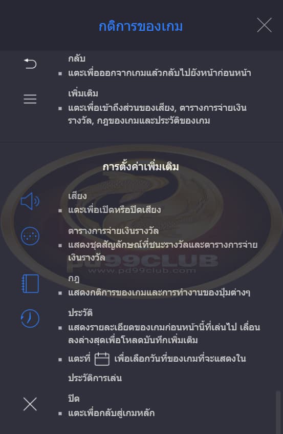 - เเตะเพื่อเข้าถึงส่วนของเสียง ตารางการจ่ายเงิน รางวัล กฏของเกมและประวัติของเกม