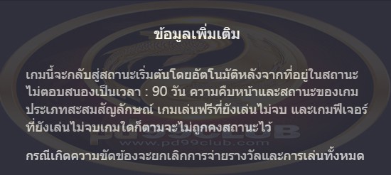 - เกมนี้จะกลับสู่สถานะเริ่มต้นโดยอัตโนมัติหลังจากที่อยู่ในสถานะไม่ตอบสนองเป็นเวลา: 90 วันความคืบหน้าและสถานะของเกมประเภทสะสมสัญลักษณ์เกมเล่นฟรีที่ยังเล่นไม่จบและเกมฟีเจอร์ที่ยังเล่นไม่จบเกมใดก็ตามจะไม่ถูกคงสถานะไว้