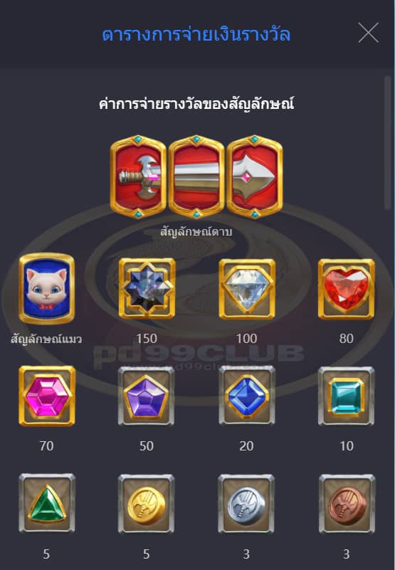 - ค่าการจ่ายรางวัลของสัญลักษณ์มีทั้งหมด 17 สัญลักษณ์