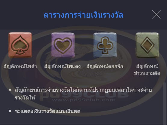 - รางวัลจากสัญลักษณ์ที่ชนะรางวัลเป็นเงินสดจะเท่ากับจำนวนที่เเสดงใน “ ตารางการจ่ายเงินรางวัล ” คูณด้วยขนาดเดิมพันและตัวคูณเดิมพัน