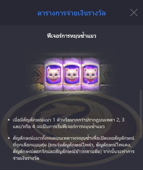 - เมื่อมีสัญลักษณ์แมว 1 ตัวหรือมากกว่าปรากฏบนเพลา 2,3 และ 4 จะเป็นการเริ่มฟีเจอร์การหมุนซํ้าแมว