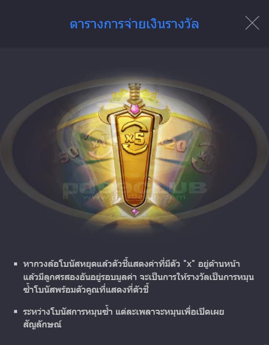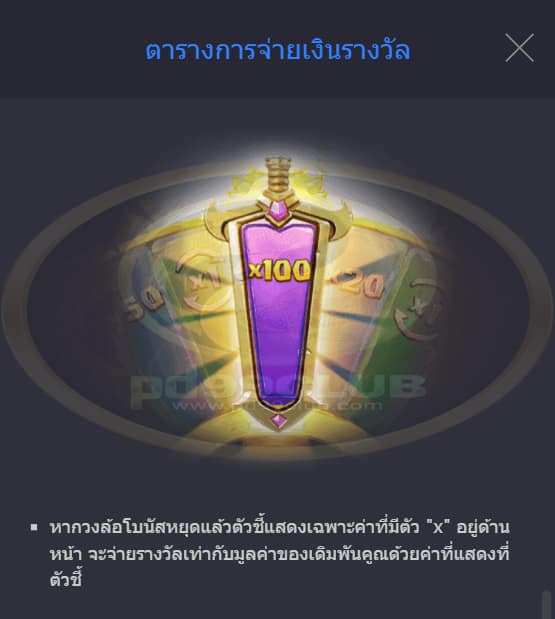 - หากวงล้อโบนัสหยุดแล้วตัวชี้เเสดงเฉพาะค่าที่มีตัว “ x ” อยู่ด้านหน้าจะจ่ายรางวัลเท่ากับมูลค่าของเดิมพันคูณด้วยค่าที่แสดงที่ตัวชี้