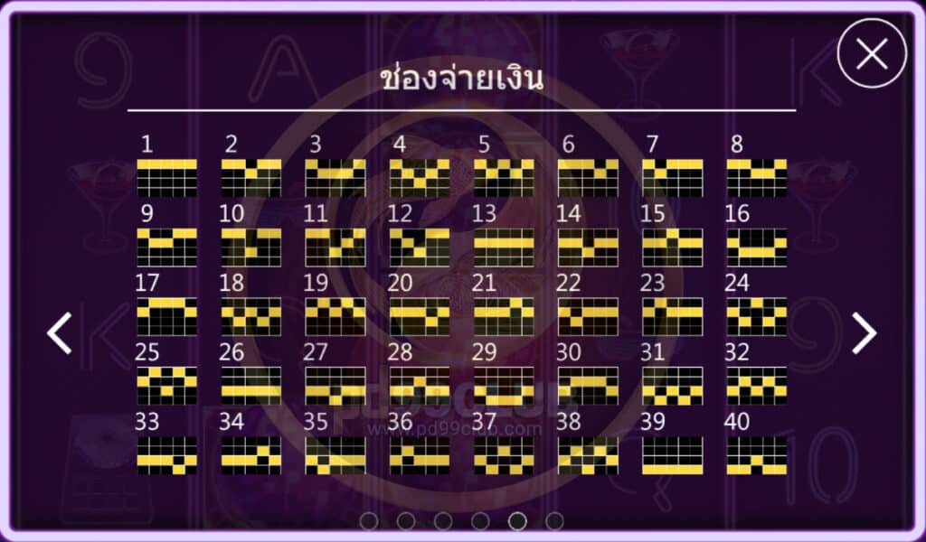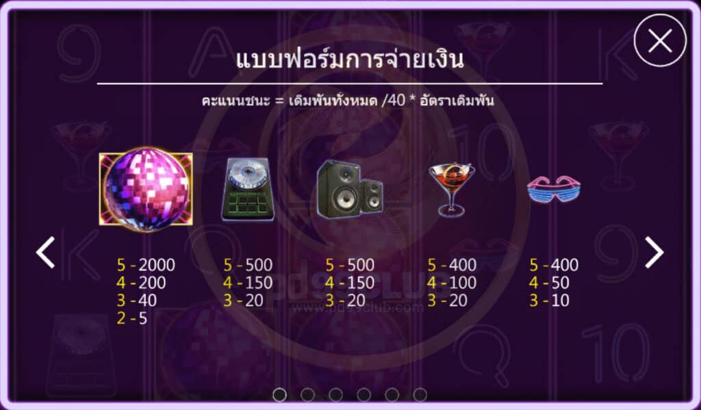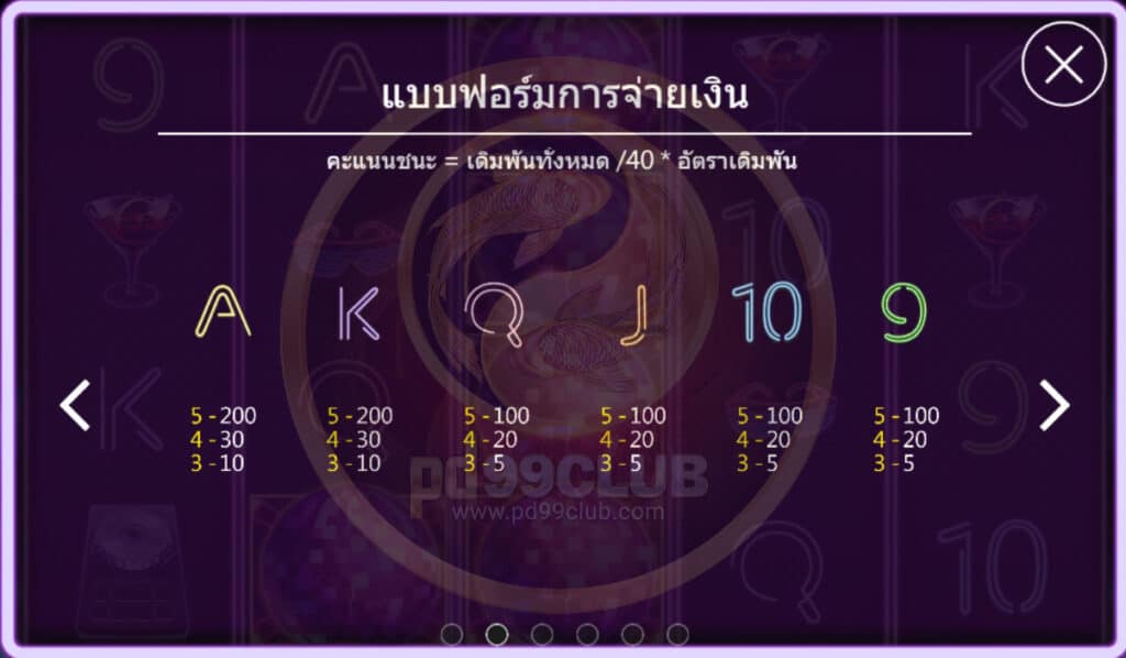 มีทั้งหมด 11 สัญลักษณ์ คะแนนชนะ=เดิมพันทั้งหมด/40*อัตราเดิมพัน