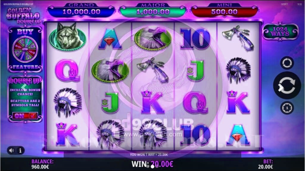 Golden Buffalo มีกลไก Double Up ที่น่าสนใจ และวางเดิมพันน้อย ทั้งหมดนี้จะช่วยให้คุณมีโอกาสที่จะทำให้การหมุนฟรีเป็นเรื่องง่ายกว่าในเกมส์ทั่วไปของสล็อตแมชชีนทั่วไป (หากไม่มีการเดิมพัน Double Up อัตราต่อรองคือ 1 ใน 200 สปิน และด้วยการเดิมพันพิเศษ จะเพิ่มสูงถึง 1 ใน 115 สปิน ) ซึ่งเป็นเรื่องที่น่าชื่นใจมากที่นอกจากจะได้ตัวคูณเงินรางวัลแล้วเกมส์เล่นง่ายเหมาะกับทั้งมือใหม่และเซ๊ยนอีกด้วย