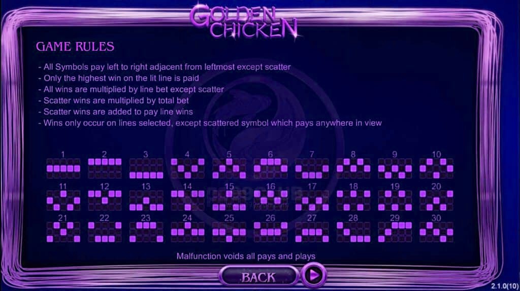 กฏกติกา และไลน์เดิมพันที่ชนะรางวัลของเกม Golden Chicken