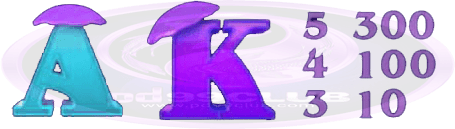 - สัญลักษณ์อักษร A และสัญลักษณ์อักษร K ติดกัน 3 ตัว อัตราการจ่ายเงินรางวัลที่คูณ 10 หากออกติดกัน 4 ตัว คูณ 100 ห้าตัวคูณ 300