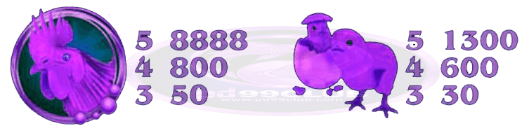 - สัญลักษณ์ลูกเจี๊ยบ ติดกัน 3 ตัว อัตราการจ่ายเงินรางวัลที่คูณ 30 หากออกติดกัน 4 ตัว คูณ 600 ห้าตัวคูณ 1300