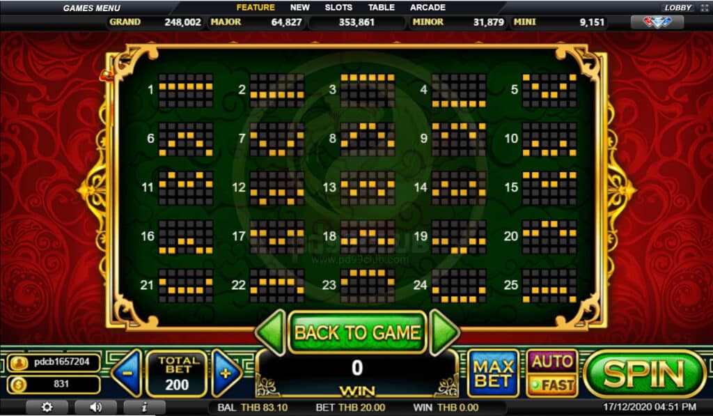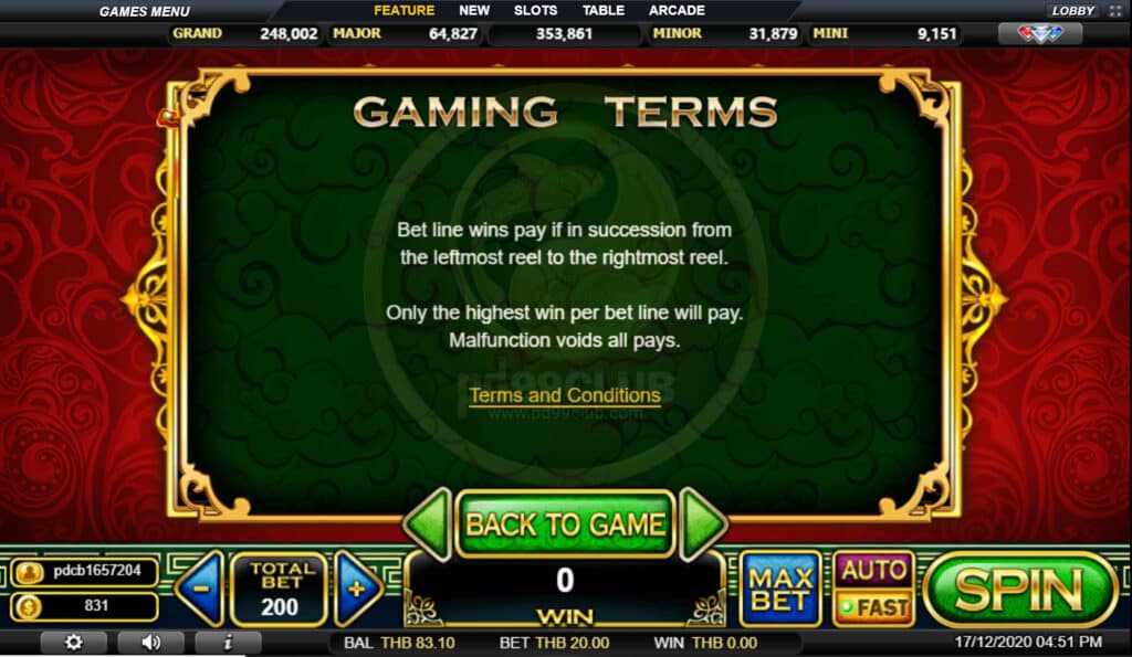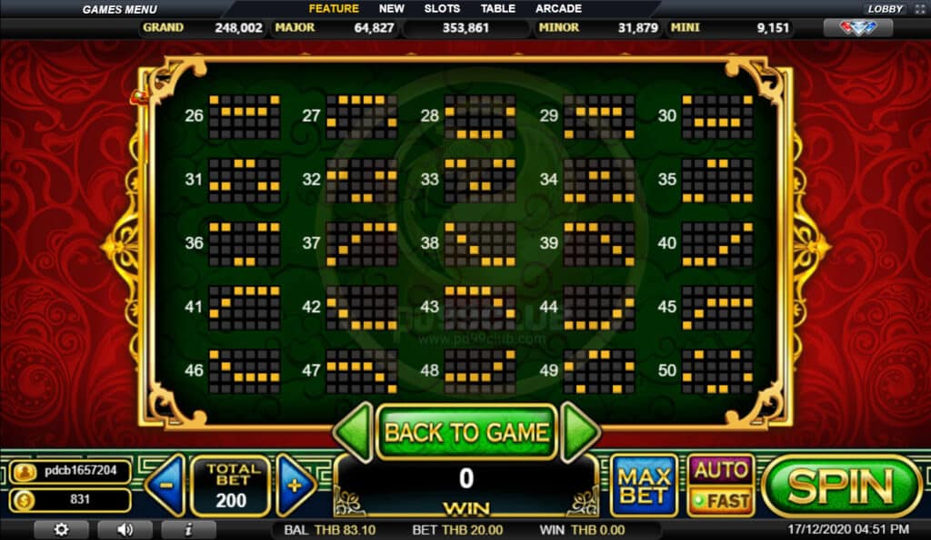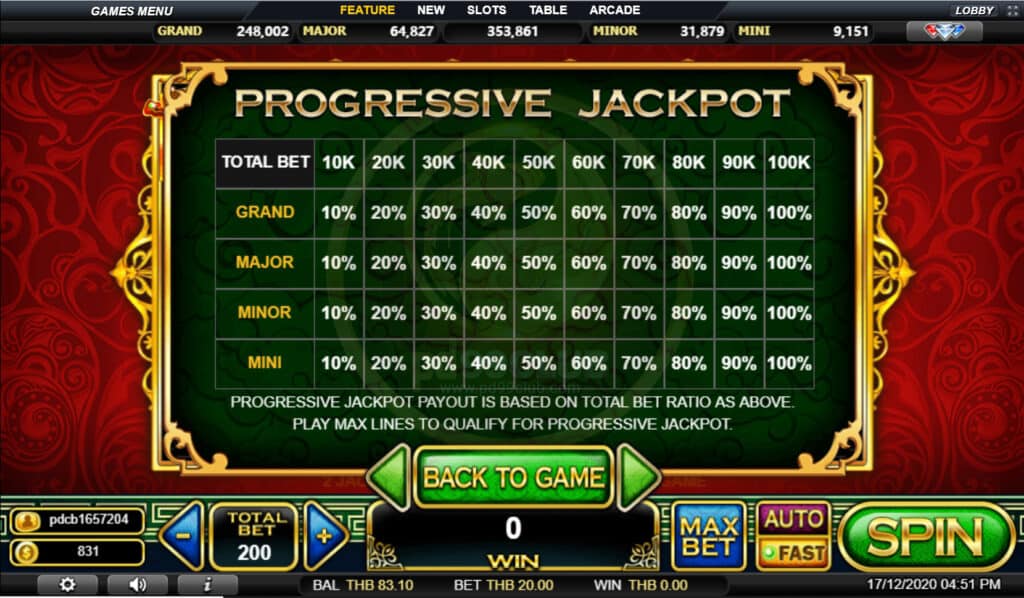 สัญลักษณ์ Progressive Jackpot การจ่ายเงินแจ็คพอตแบบก้าวหน้าขึ้นอยู่กับอัตราส่วนการเดิมพันทั้งหมดที่กล่าวมา เล่น MAX LINES เพื่อคุณสมบัติสำหรับแจ็คพอตที่ก้าวหน้า