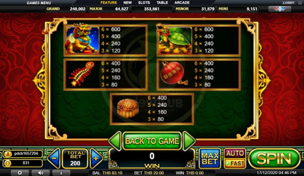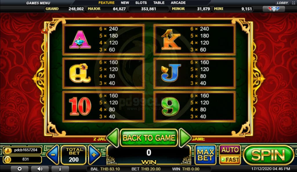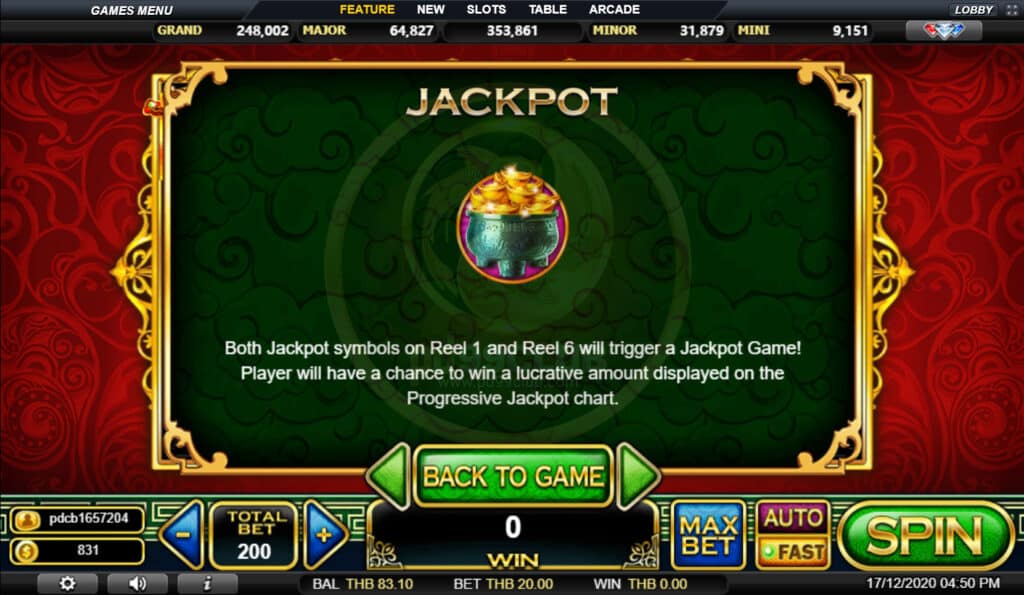 สัญลักษณ์ Jackpot จะปรากฏบนรีล 1 และรีล 6 จะทำให้เกมแจ็คพอตขึ้น! ผู้เล่นจะมีโอกาสชนะรางวัลเป็นจำนวนเงินที่แสดงในแผนภูมิโปรเกรสซีฟแจ็คพอต