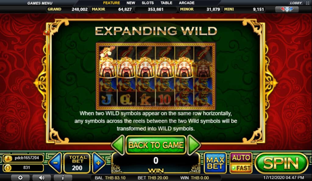 สัญลักษณ์ Wild สามารถใช้ทดแทนทุกสัญลักษณ์ยกเว้นสัญลักษณ์ Scatter และ Jackpot