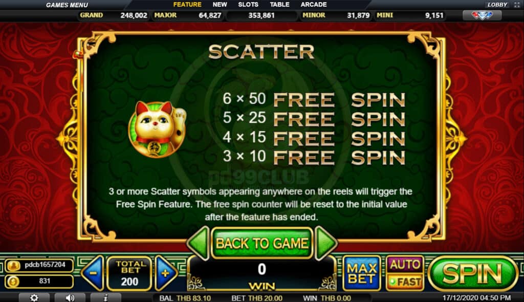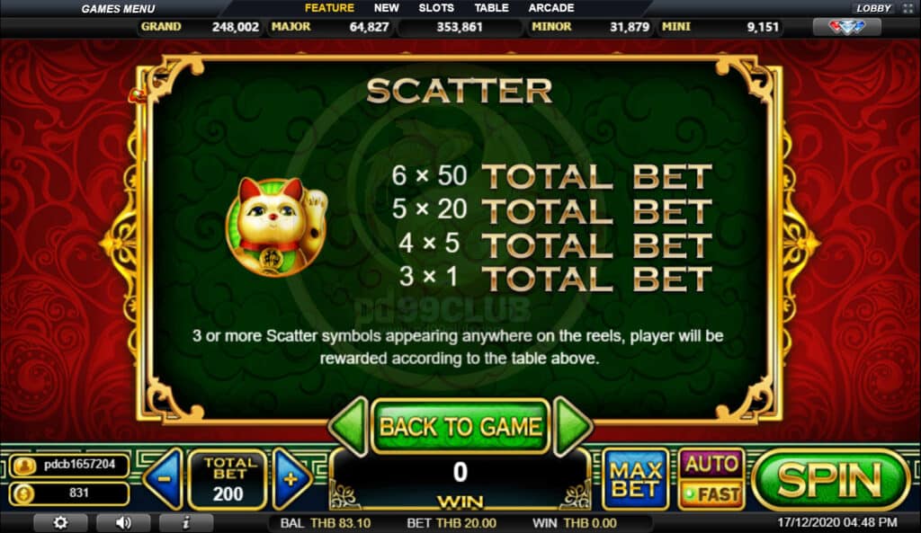 สัญลักษณ์ Scatter Total Bet 3 หรือมากกว่าสัญลักษณ์กระจายปรากฏที่ใดก็ได้บนวงล้อผู้เล่นจะได้รับรางวัลตามตารางด้านบน