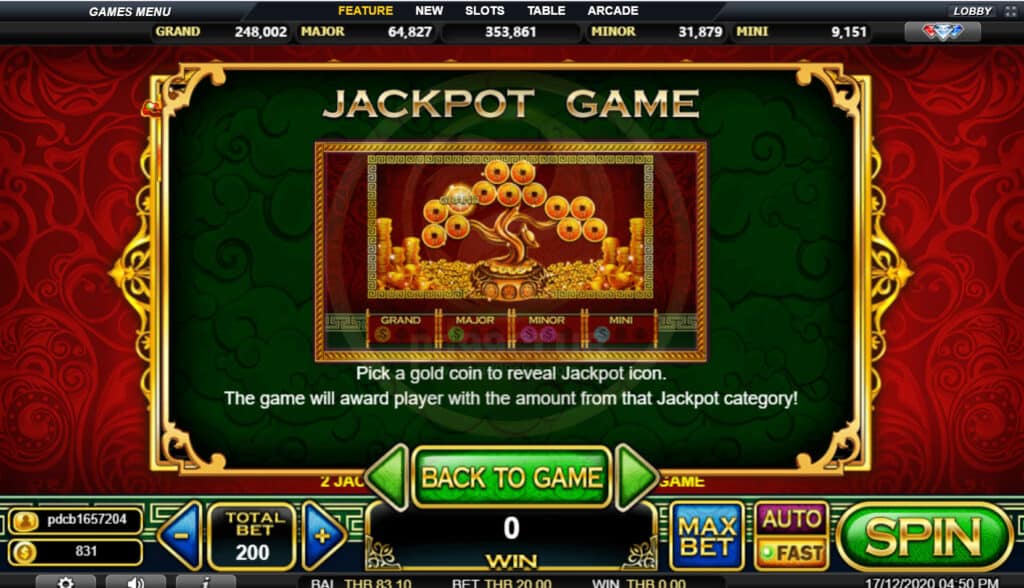 สัญลักษณ์ Jackpot Game เลือกเหรียญทองเพื่อแสดงไอคอนแจ็คพอต เกมจะมอบรางวัลให้กับผู้เล่นด้วยจำนวนเงินจากหมวดแจ็คพอตนั้น!