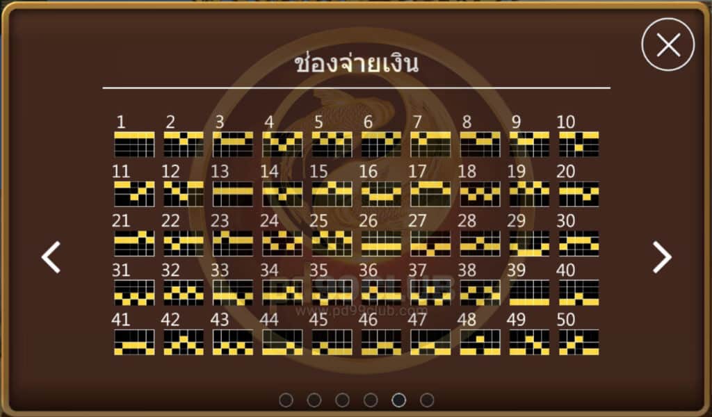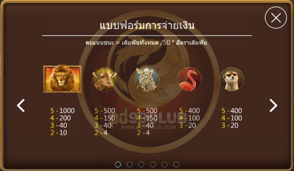 มีทั้งหมด 11 สัญลักษณ์ คะเเนนชนะ=เดิมพันทั้งหมด/50*อัตราเดิมพัน