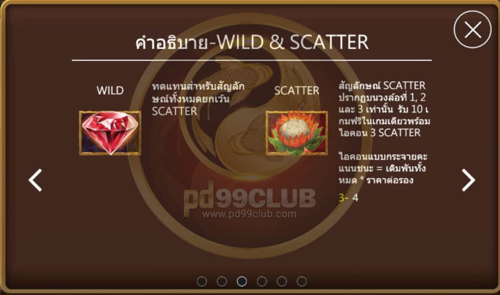 สัญลักษณ์ Scatter ปรากฏบนวงล้อที่1,2 และ3 เท่านั้น รับ 10 เกมฟรีในเกมเดียวพร้อมไอคอน 3 Scatter