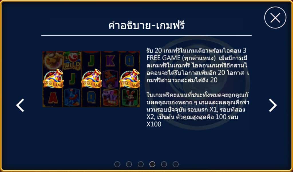 สัญลักษณ์ Free Game ปรากฏบนวงล้อที่ 1,3 และ 5 เท่านั้น รับฟรีในเกมเดียว พร้อมไอคอน 3 Free Game (ทุกตำแหน่ง)