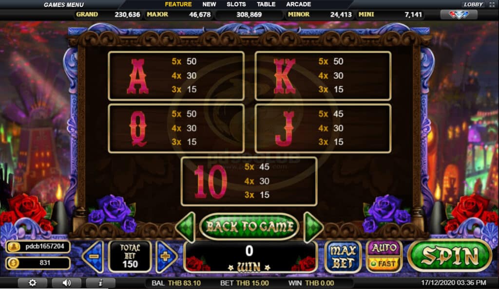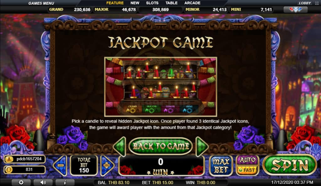 สัญลักษณ์ Jackpot Game เลือกเทียนเพื่อเปิดเผยไอคอนแจ็คพอตที่ซ่อนอยู่ เมื่อผู้เล่นพบไอคอนแจ็คพอตที่เหมือนกัน 3 ไอคอนเกมจะมอบรางวัลให้กับผู้เล่นด้วยจำนวนเงินจากหมวดแจ็คพอตนั้น!