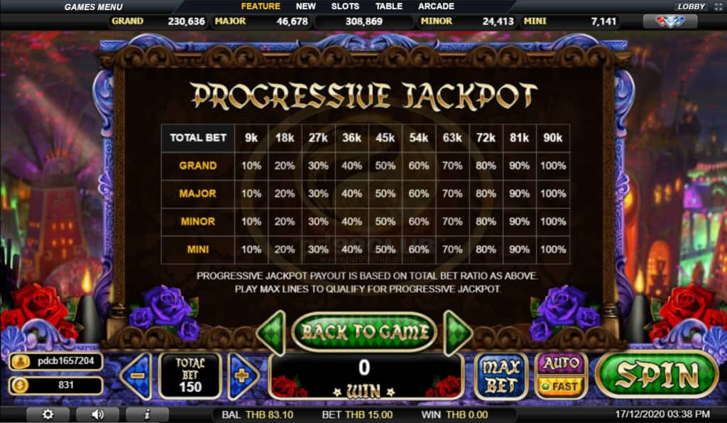 สัญลักษณ์ Progressive Jackpot การจ่ายเงินแจ็คพอตแบบก้าวหน้าขึ้นอยู่กับอัตราส่วนการเดิมพันทั้งหมดข้างต้นเล่นเส้นสูงสุดเพื่อให้มีคุณสมบัติเหมาะสมสำหรับแจ็คพอตแบบก้าวหน้า