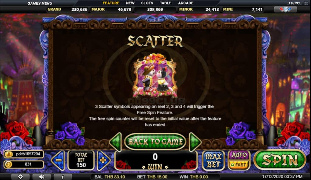 สัญลักษณ์ Scatter 3 สัญลักษณ์จะปรากฏบนรีล 2, 3 และ 4 จะเรียกใช้คุณสมบัติหมุนฟรี ตัวนับการหมุนฟรีจะถูกรีเซ็ตเป็นค่าเริ่มต้นหลังจากคุณสมบัติสิ้นสุดลง