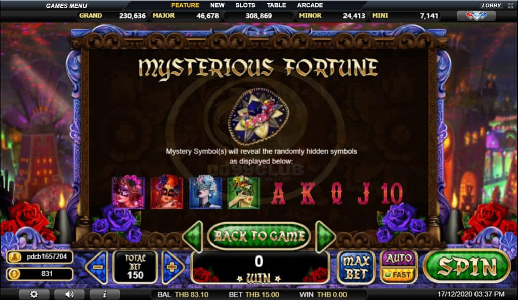 สัญลักษณ์ Mysterious Fortune สัญลักษณ์ลึกลับจะเปิดเผยสัญลักษณ์ที่ซ่อนแบบสุ่มตามที่แสดงด้านล่าง