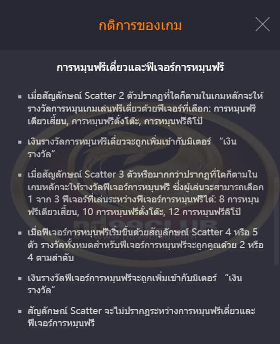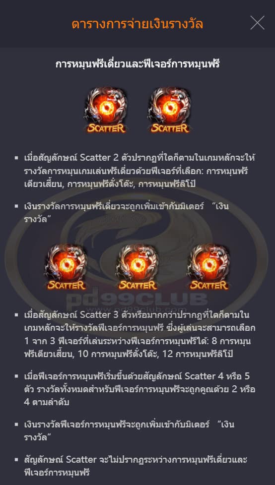 - สัญลักษณ์ Scatter จะไม่ปรากฏระหว่างการหมุนฟรีเดี่ยวเเละฟีเจอร์การหมุนฟรี