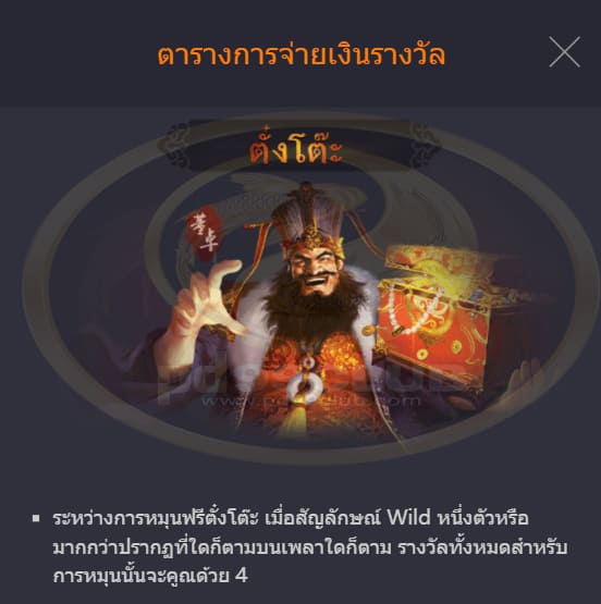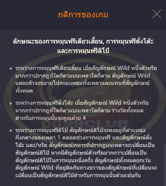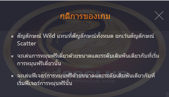 - จะเล่นฟีเจอร์การหมุนฟรีด้วยขนาดและระดับเดิมพันเดียวกันกับการหมุนที่เริ่มฟีเจอร์การหมุนฟรีนั้น
