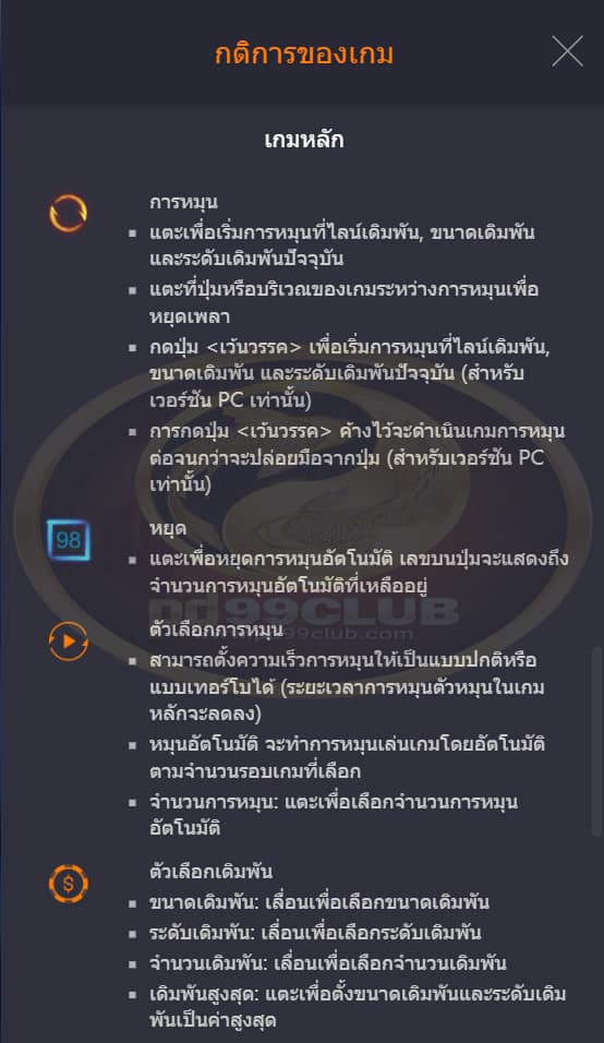 - ระดับเดิมพัน: เลื่อนเพื่อเลือกระดับเดิมพัน