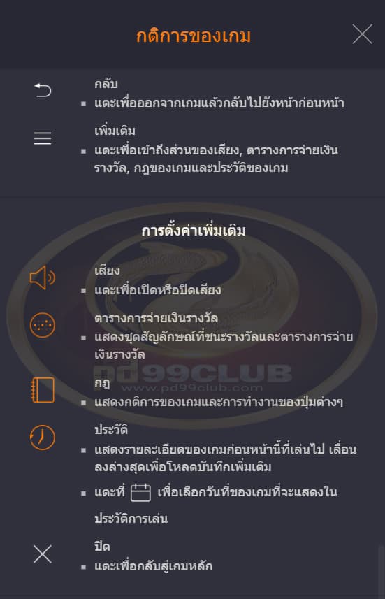 - เเตะเพื่อเข้าถึงส่วนของเสียง ตารางการจ่ายเงิน รางวัล กฏของเกมและประวัติของเกม