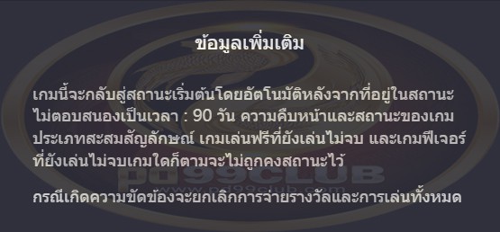 - เกมนี้จะกลับสู่สถานะเริ่มต้นโดยอัตโนมัติหลังจากที่อยู่ในสถานะไม่ตอบสนองเป็นเวลา: 90 วันความคืบหน้าและสถานะของเกมประเภทสะสมสัญลักษณ์เกมเล่นฟรีที่ยังเล่นไม่จบและเกมฟีเจอร์ที่ยังเล่นไม่จบเกมใดก็ตามจะไม่ถูกคงสถานะไว้