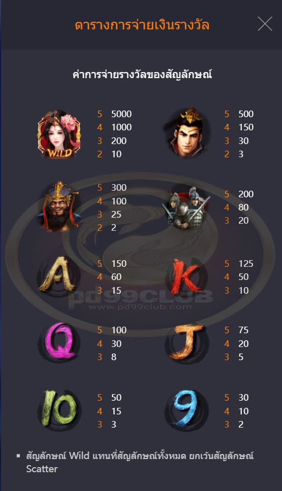 - สัญลักษณ์ Wild แทนที่สัญลักษณ์ทั้งหมดยกเว้นสัญลักษณ์ Scatter