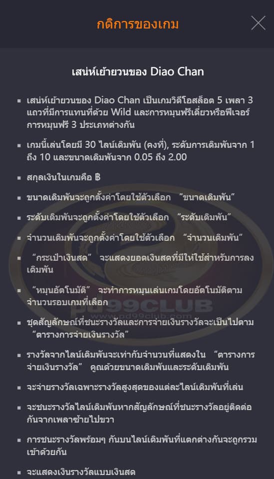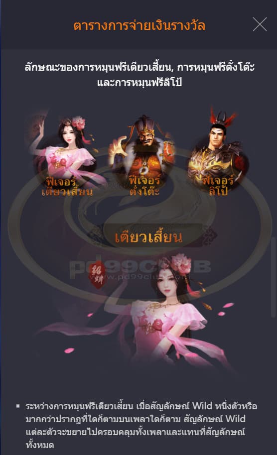 - Honey Trap of Diao Chan เป็นเกมสล็อตวิดีโอ 5 เพลา 3 แถวที่มีการแทนที่ด้วย Wild และการหมุนฟรีเดี่ยวหรือฟีเจอร์การหมุนฟรี 3 ประเภทต่างกัน