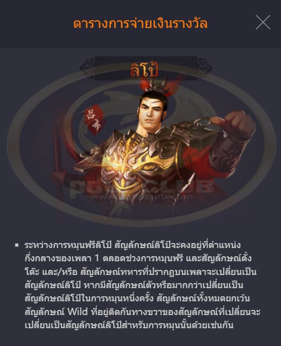 - ระหว่างการหมุนฟรีลิโป้ สัญลักษณ์ลิโป้จะคงอยู่ตำแหน่งกึ่งกลางของเพลา 1 ตลอดช่วงการหมุนฟรี และสัญลักษณ์ตั๋งโต๊ะ หรือสัญลักษณ์ทหารที่ปรากฏบนเพลาจะเปลี่ยนเป็นสัญลักษณ์ลิโป้ หากมีสัญลักษณืตัวหรือมากกว่าเปลี่ยนเป็นสัญลักษณ์ลิโป้ในการหมุนหนึ่งครั้ง สัญลักษณ์ทั้งหมดยกเว้นสัญลักษณ์ Wild ที่อยู่ติดกันทางขวาของสัญลักษณ์ที่เปลี่ยนจะเปลี่ยนเป็นสัญลักษณ์ลิโป้สำหรับการหมุนนั้นด้วยเช่นกัน