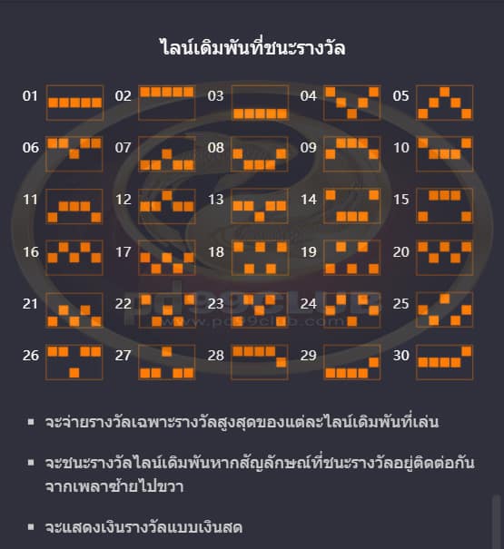 - ไลน์เดิมพันที่ชนะรางวัลมีทั้งหมด 30 ไลน์เดิมพัน