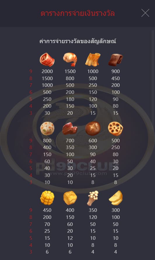 แสดงชุดสัญลักษณ์ที่ชนะรางวัลและตารางการจ่ายเงินรางวัล