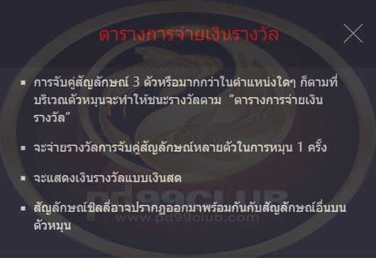 การจับคู่สัญลักษณ์ 3 ตัวหรือมากกว่าในตำแหน่งใดๆก็ตามที่บริเวณตัวหมุนจะทำให้ชนะรางวัลตาม “ ตารางการจ่ายเงินรางวัล ”