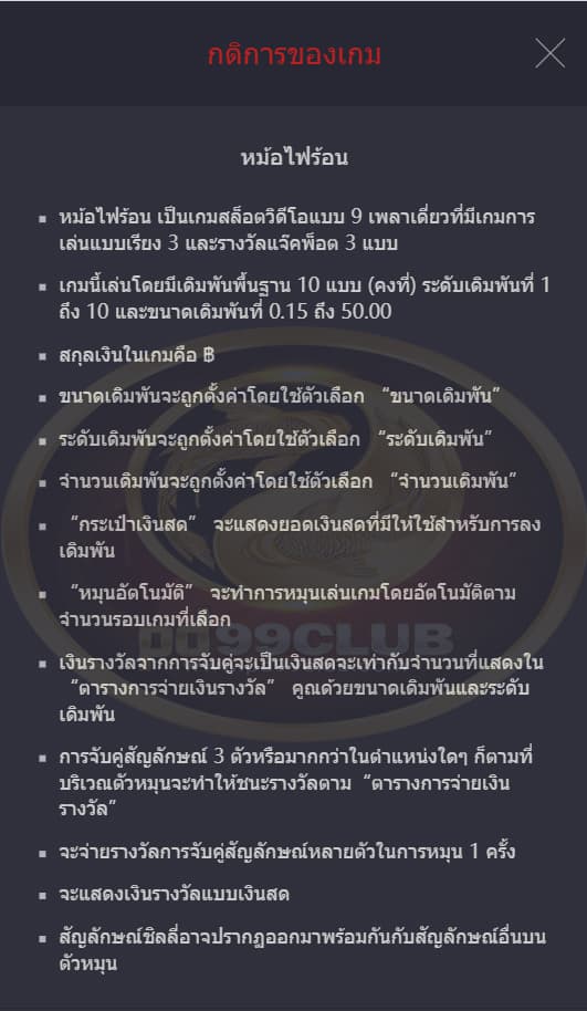 Hot Pot เป็นเกมสล็อตวิดีโอเเบบ 9 เพลาเดี่ยวที่มีเกมการเล่นเเบบเรียง 3 และรางวัลเเจ็ตพ็อต 3 แบบ