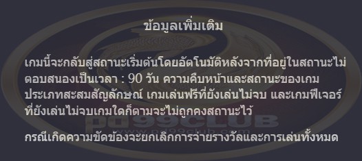 เกมนี้จะกลับสู่สถานะเริ่มต้นโดยอัตโนมัติหลังจากที่อยู่ในสถานะไม่ตอบสนองเป็นเวลา: 90 วันความคืบหน้าและสถานะของเกมประเภทสะสมสัญลักษณ์เกมเล่นฟรีที่ยังเล่นไม่จบและเกมฟีเจอร์ที่ยังเล่นไม่จบเกมใดก็ตามจะไม่ถูกคงสถานะไว้