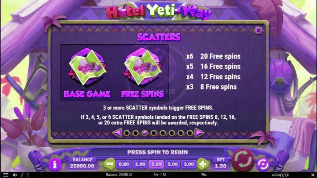- หากสัญลักษณ์ Scatter 3 , 4 , 5 หรือ 6 อันปรากฏใน Free Spins จะได้รับ Free Spins เพิ่ม 8 , 12 , 16 หรือ 20 ครั้งตามลำดับ