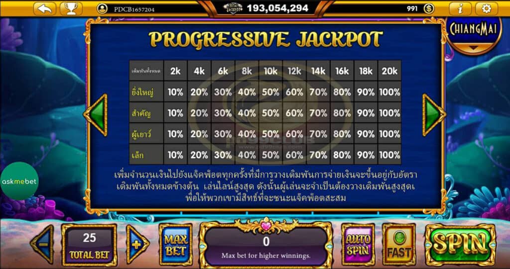 สัญลักษณ์ Progressive Jackpot จะสามารถเพิ่มจำนวนเงินไปยังเเจ็คพอตทุกครั้งที่มีการวางเดิมพันการจ่ายเงินจะขึ้นอยู่กับอัตราเดิมพันทั้งหมดข้างต้น เล่นไลน์เดิมพันสูงสุดดังนั้นผู้เล่นจำเป็นต้องวางเดิมพันสูงสุดเพื่อให้พวกเขามีสิทธิ์ที่จะชนะ รางวัลเเจ็คพอตสะสม