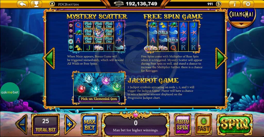 สัญลักษณ์ Mystery Scatter เมื่อ Nixie ปรากฏขึ้นเกมโบนัสจะถูกเรียกใช้ทันทีซึ่งจะให้รางวัล Wilds หรือ Free Spins ทั้งหมด