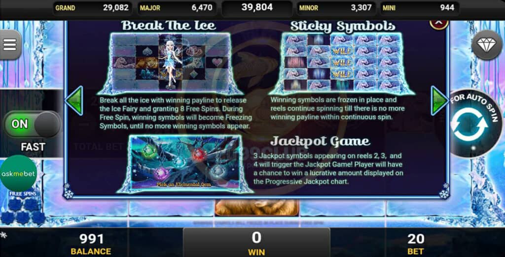 สัญลักษณ์ Bieak The Ice จะสามารถทำลายน้ำแข็งทั้งหมดด้วยเพย์ไลน์ที่ชนะเพื่อปล่อยนางฟ้าน้ำแข็งและให้ 8 ฟรีสปิน ระหว่าง Free Spin สัญลักษณ์ที่ชนะจะกลายเป็น Freezing Symbols จนกว่าจะไม่มีสัญลักษณ์ที่ชนะอีกต่อไป
