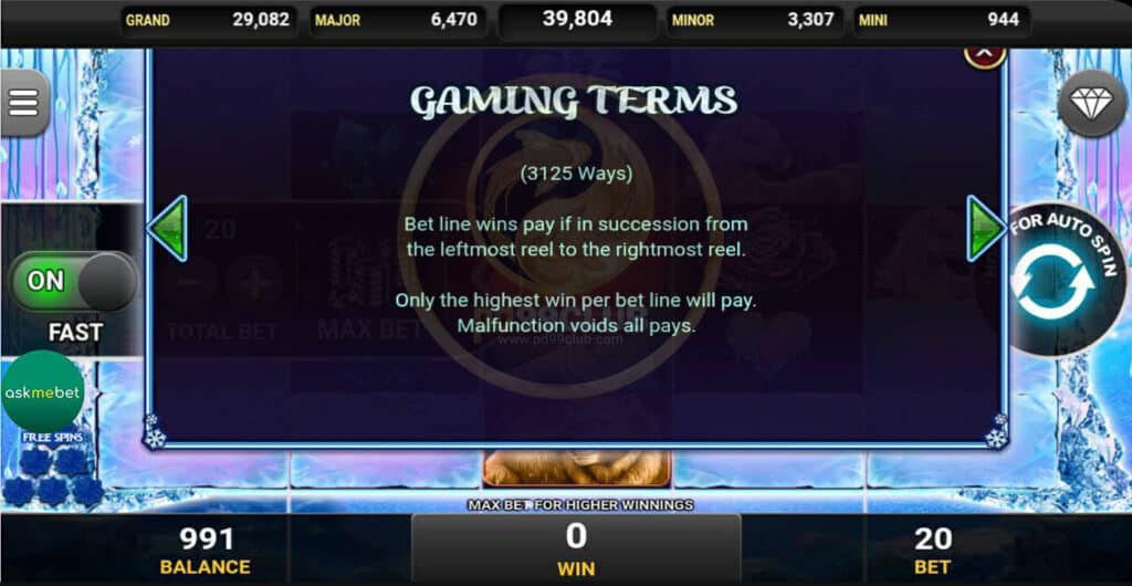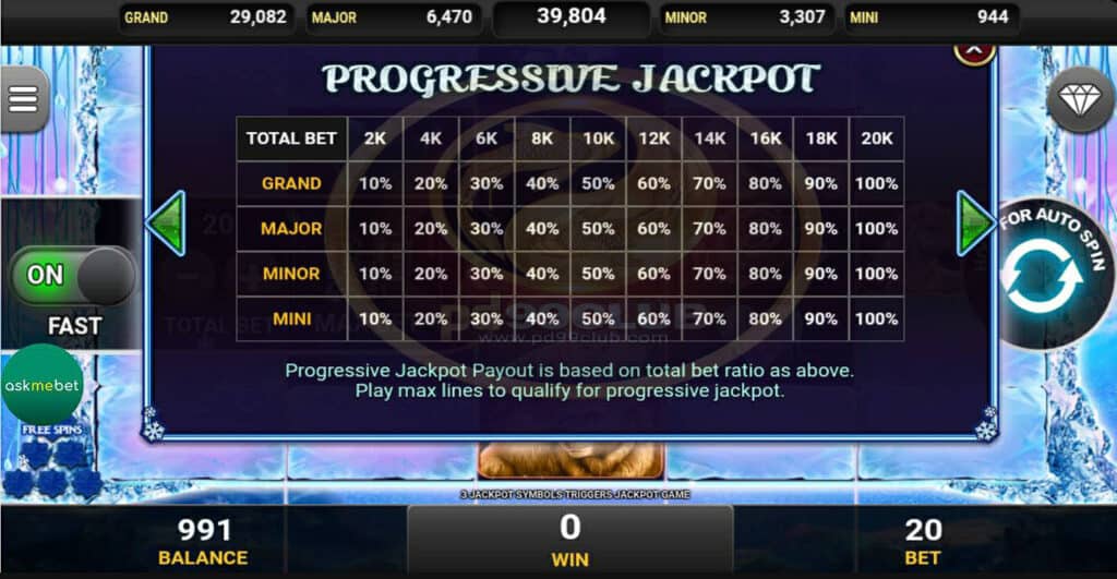 สัญลักษณ์ Progressive Jackpot จะสามารถเพิ่มจำนวนเงินไปยังเเจ็คพอตทุกครั้งที่มีการวางเดิมพันการจ่ายเงินจะขึ้นอยู่กับอัตราเดิมพันทั้งหมดข้างต้น เล่นไลน์เดิมพันสูงสุดดังนั้นผู้เล่นจำเป็นต้องวางเดิมพันสูงสุดเพื่อให้พวกเขามีสิทธิ์ที่จะชนะ รางวัลเเจ็คพอตสะสม