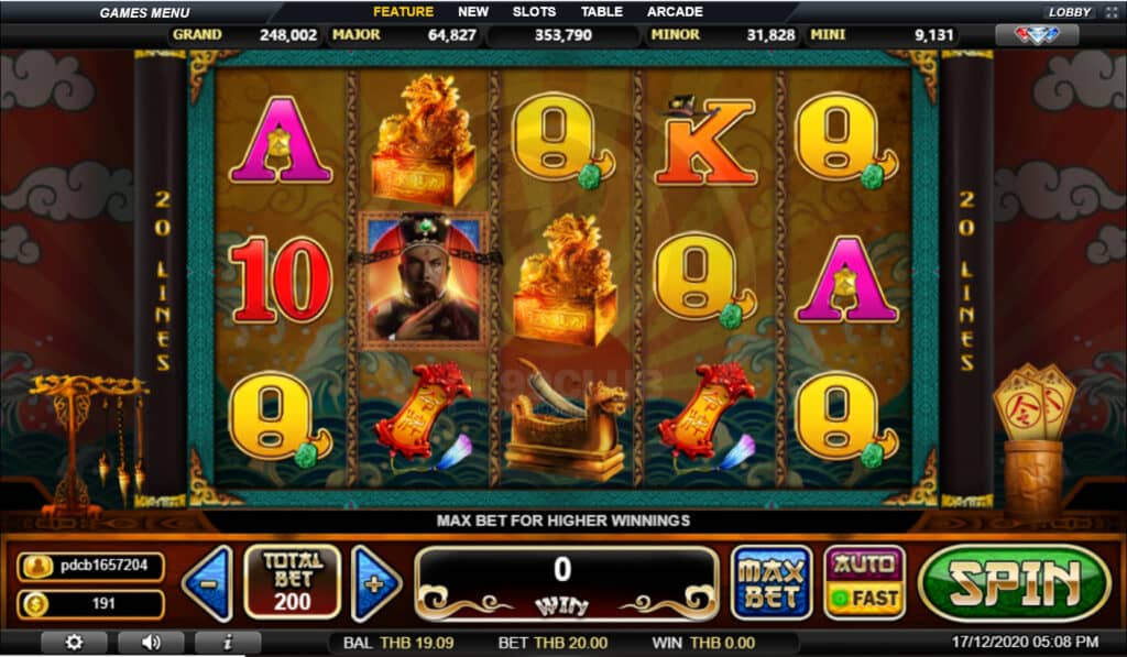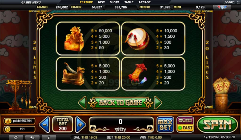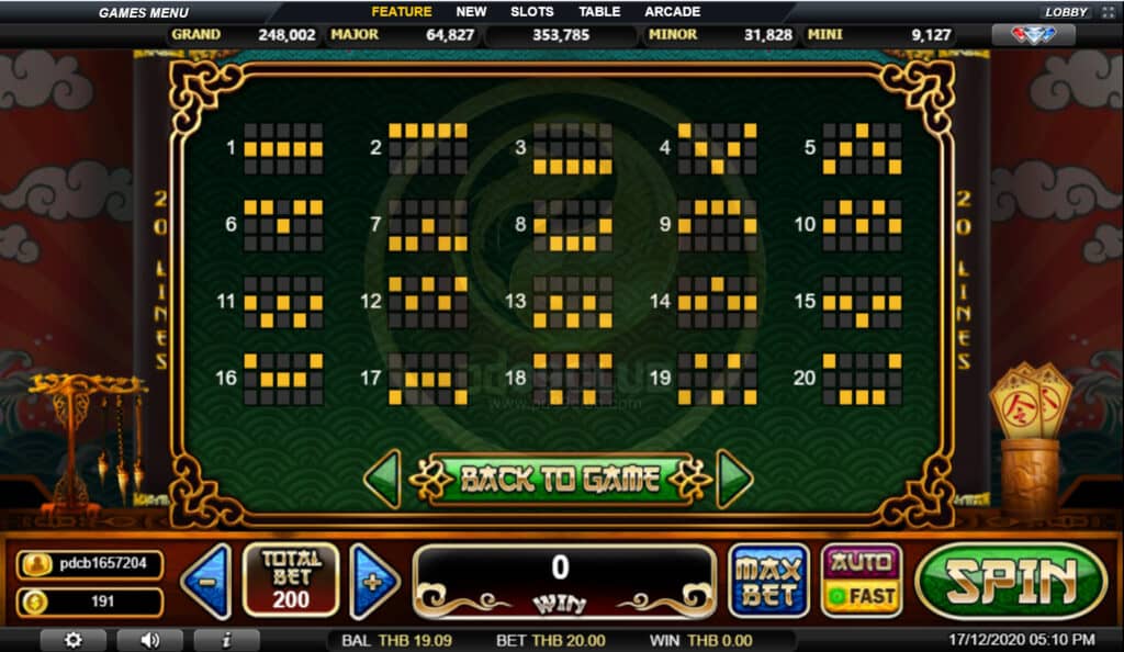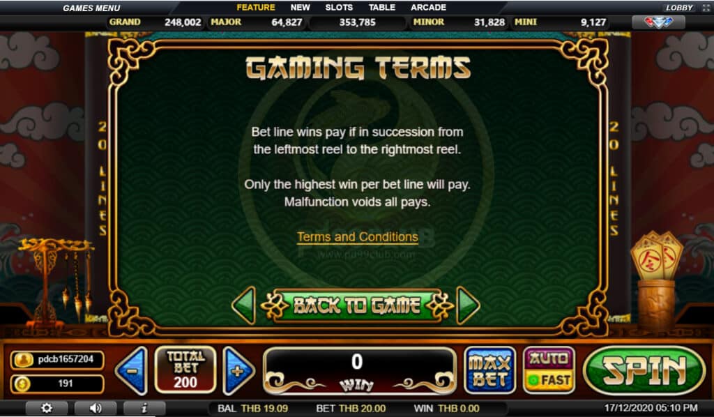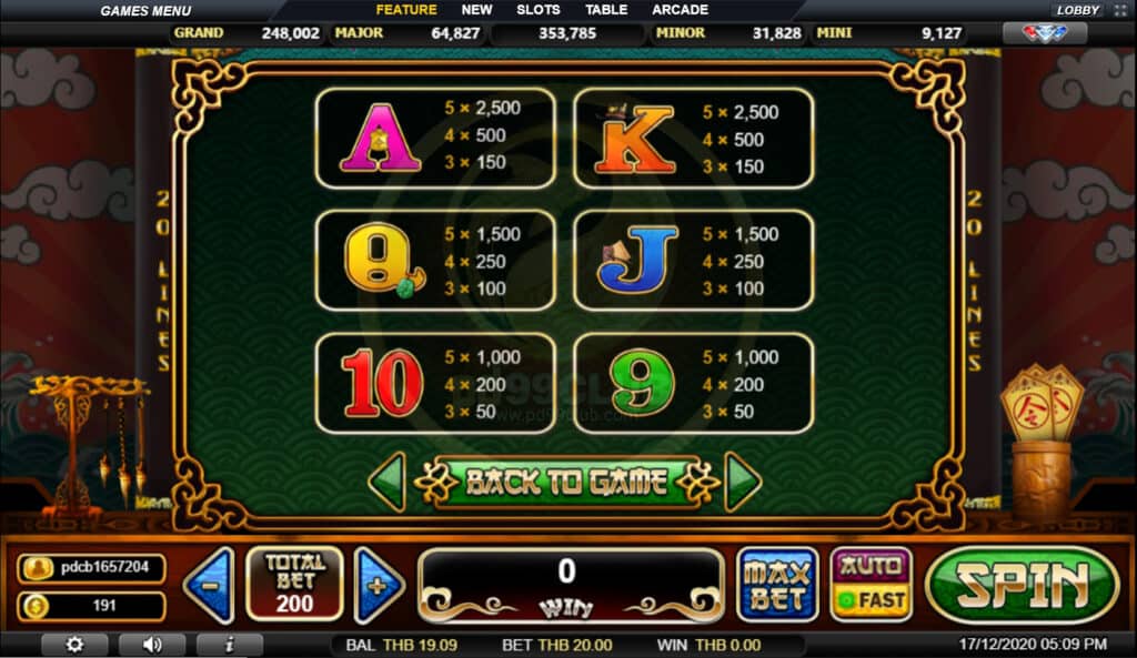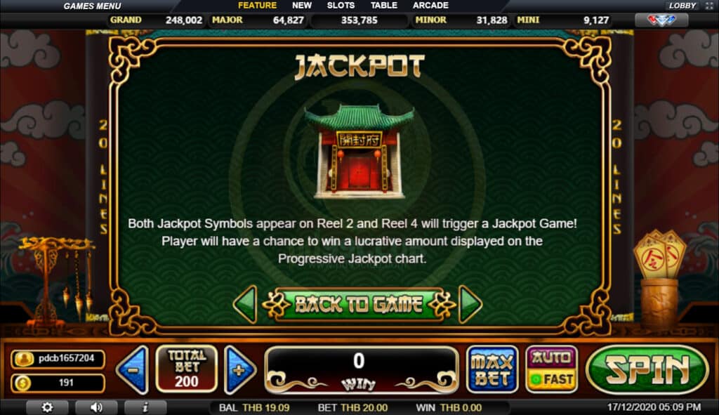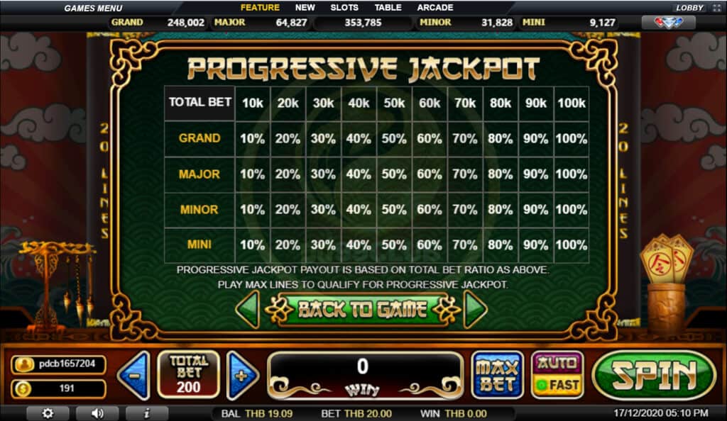 สัญลักษณ์ Progressive Jackpot การจ่ายเงินแจ็คพอตแบบก้าวหน้าขึ้นอยู่กับอัตราส่วนการเดิมพันทั้งหมดที่กล่าวมา เล่น MAX LINES เพื่อคุณสมบัติสำหรับแจ็คพอตที่ก้าวหน้า