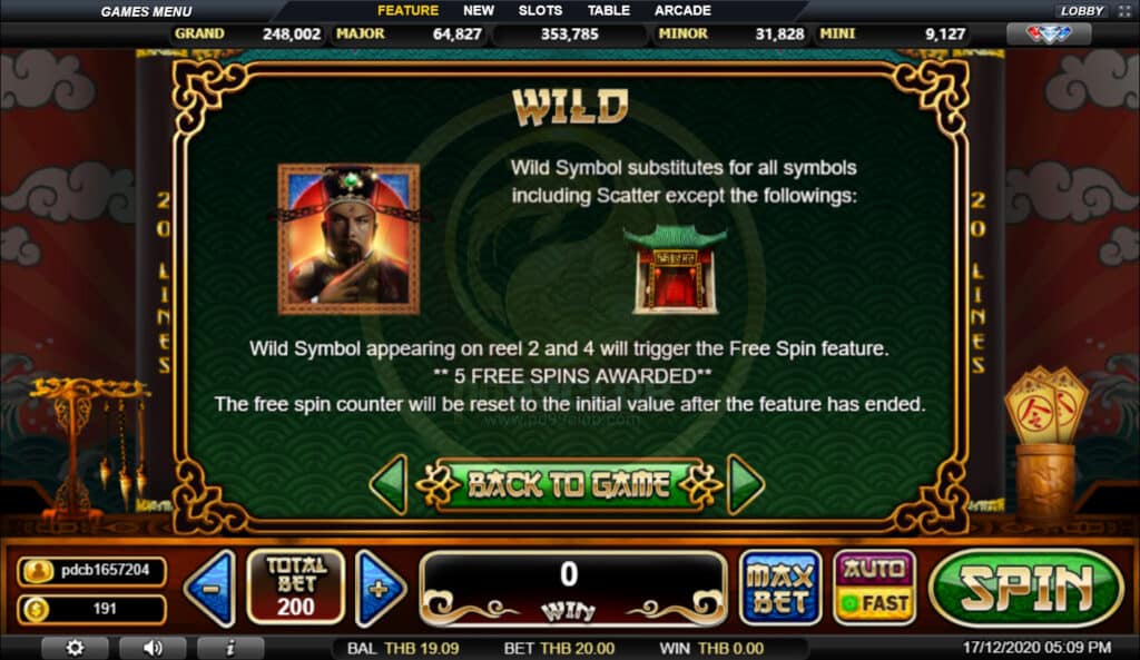สัญลักษณ์ Wild สัญลักษณ์ Wild จะแทนที่สัญลักษณ์ทั้งหมดรวมถึง Scatter ยกเว้นสิ่งต่อไปนี้:Jackpot สัญลักษณ์ Wild ที่ปรากฏบนรีล 2 และ 4 จะเรียกใช้คุณสมบัติ Free Spin ** รางวัลการหมุนฟรี 5 ครั้ง ** ตัวนับการหมุนฟรีจะถูกรีเซ็ตเป็นค่าเริ่มต้นหลังจากคุณสมบัติสิ้นสุดลง