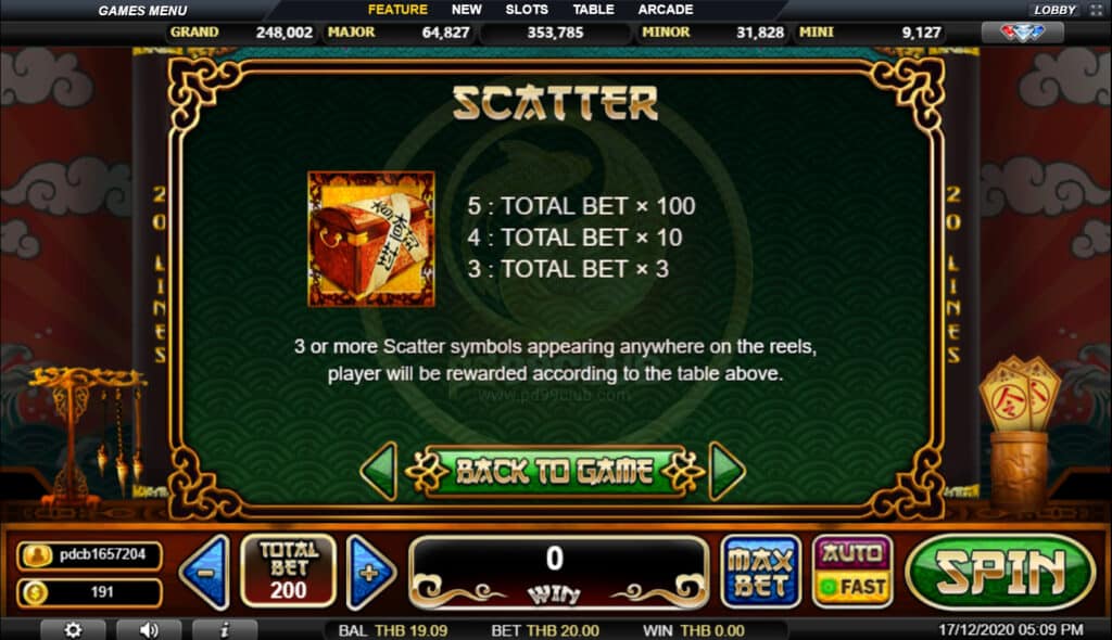 สัญลักษณ์ Scatter กระจาย 3 ตัวขึ้นไปปรากฏที่ใดก็ได้บนวงล้อผู้เล่นจะได้รับรางวัลตามตารางด้านบน