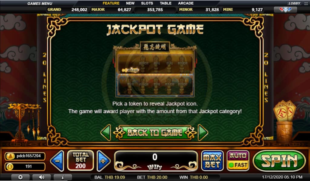 สัญลักษณ์ Jackpot Game เลือกโทเค็นเพื่อแสดงไอคอนแจ็คพอต เกมจะมอบรางวัลให้กับผู้เล่นด้วยจำนวนเงินจากหมวดแจ็คพอตนั้น!