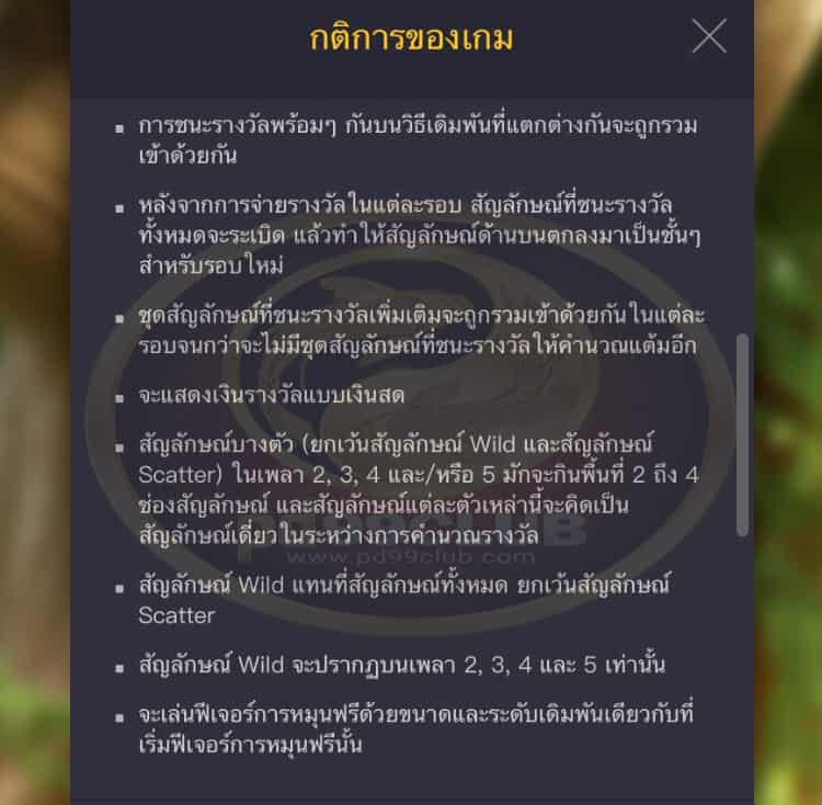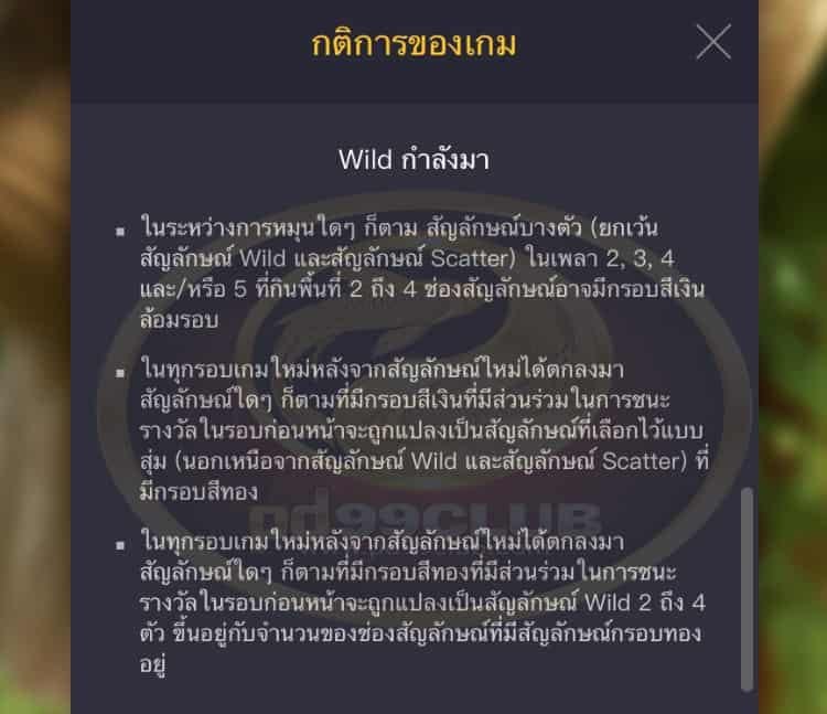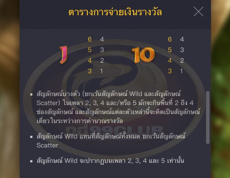 - สัญลักษณ์ Wild แทนที่สัญลักษณ์ทั้งหมด ยกเว้นสัญลักษณ์ Scatter