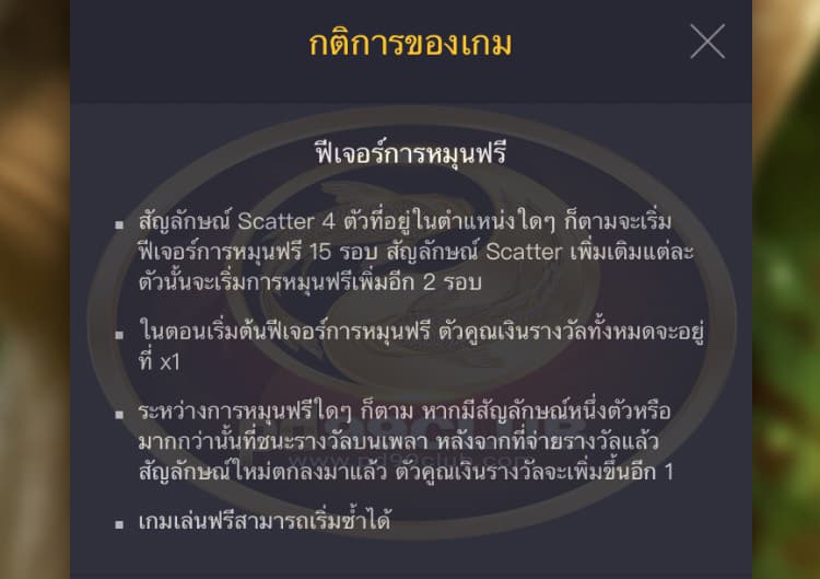 - ในตอนเริ่มต้นฟีเจอร์การหมุนฟรีตัวคูณเงินรางวัลจะอยู่ที่ x1