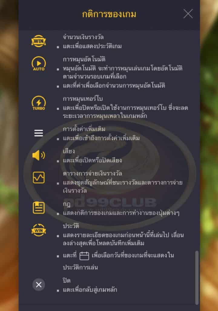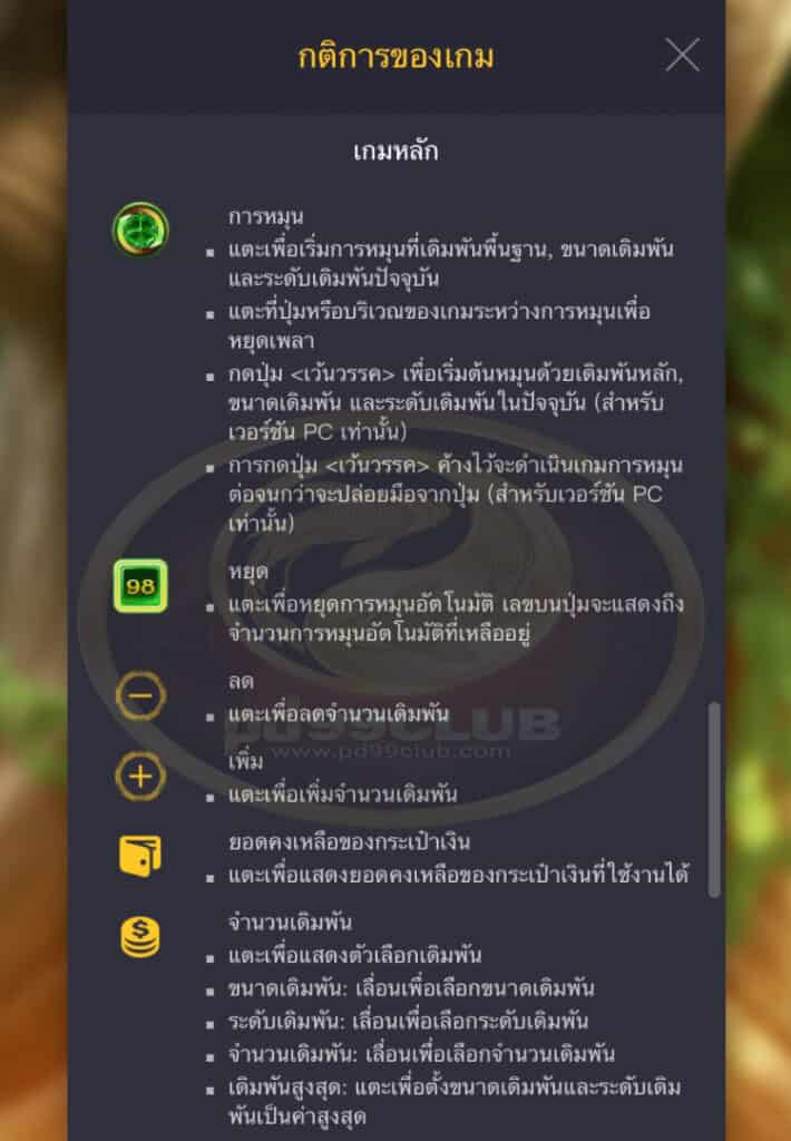 - หมุนอัตโนมัติจะทำการหมุนเล่นเกมโดยอัตโนมัติตามจำนวนรอบเกมที่เลือก