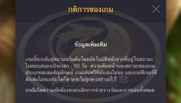 - เกมนี้จะกลับสู่สถานะเริ่มต้นโดยอัตโนมัติหลังจากที่อยู่ในสถานะไม่ตอบสนองเป็นเวลา: 90 วันความคืบหน้าและสถานะของเกมประเภทสะสมสัญลักษณ์เกมเล่นฟรีที่ยังเล่นไม่จบและเกมฟีเจอร์ที่ยังเล่นไม่จบเกมใดก็ตามจะไม่ถูกคงสถานะไว้