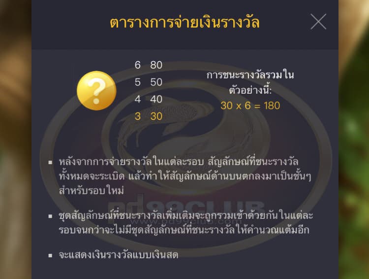 - ชุดสัญลักษณ์ที่ชนะรางวัลและการจ่ายเงินรางวัลจะเป็นไปตาม “ ตารางการจ่ายเงินรางวัล”